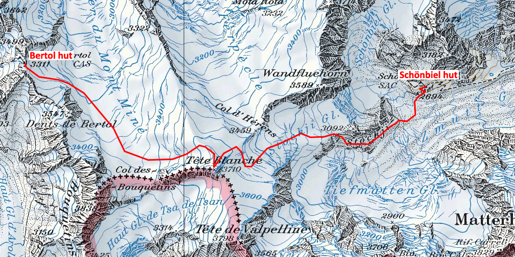 A view from the east showing the route down from the Col de la Tête Blanche to the Schönbiel hut.