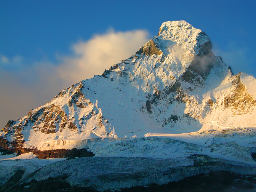 The North Face of the Matterhorn. This photo was taken at sunrise from a point just a bit above the trail between Zmutt and the Schönbiel hut. The normal route on the peak is the Hörnli ridge, the left skyline. The Zmuttgrat is the ridge on the right side.
