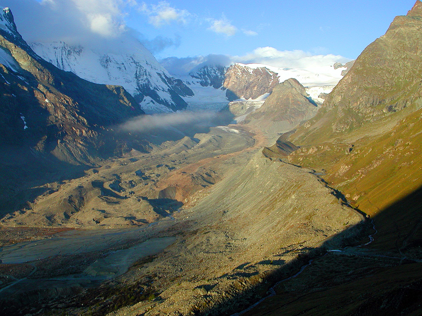 Looking up the Zmutt Glacier towards the Col de la Tête Blanche, under cloud on the right. The Matterhorn is just out of view to the left, and the Dent d'Hérens is mostly under cloud, also on the left. If you were to follows the lateral moraine just right of center, you would arrive at the Schönbiel hut.