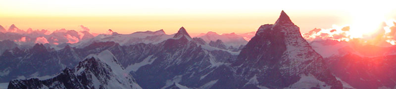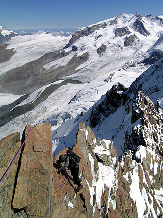 This is an ambitious program that takes in both the traverse of the entire Monte Rosa group, as well as an ascent of the Matterhorn. Monte Rosa is the highest peak in Switzerland and its traverse gives us 3 nights in high huts, as well as climbing several 4000 meter summits along the way. When it comes time to do the Matterhorn, we should be well acclimated and quite ready for the additional challenges this climb presents. For this program we prefer to climb at a 1 to 1 ratio, that is, one climber per guide. while this is essential for safety reasons on the Matterhorn, it also is advisable for the more difficult variations on the Monte Rosa Traverse. Difficulty This is a challenging program for experienced climbers. The Monte Rosa traverse includes both rock and ice, and is especially exposed on the traverse of the Liskamm ridge. Here, we have a mix of snow and rock on a very airy crest. Surefootedness is essential. The Matterhorn is more difficult still, and is primarily a rock climb, with some steep snow. The challenge on this peak is to keep to good time while climbing carefully and smoothly. In technical terms the difficulties are not extreme, being only about 5.6 (French 4c). But this route is very exposed and entail thousands of feet of steep rock that must be climbed quickly and surely, over 4000 feet of steep climbing from hut to summit, which must be descended as well. Climbers must be able to keep to a pace which allows an ascent in 4 to 5 hours. The descent takes about the same amount of time. The Matterhorn needs to be in good, relatively dry (snow free) climbing condition to be a reasonable objective. Please see our Matterhorn Conditions page for a much more detailed discussion of this. |