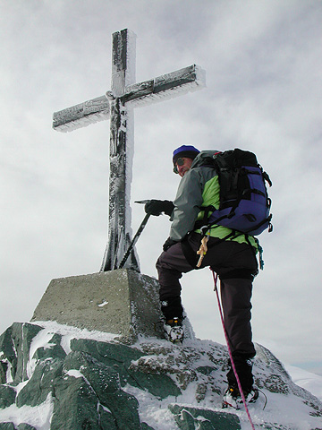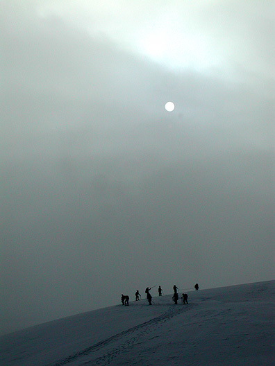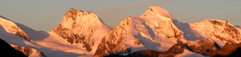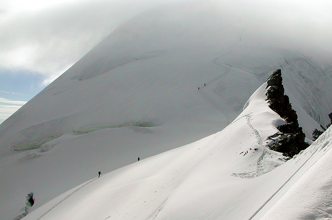 There are a number of big peaks in the Alps, the 4000 meter summits, that by virtue of their height become magnets for alpinists. And of these, the technically easier ones are very popular. There are two such summits, known to be technically less demanding than most, the Breithorn above Zermatt and the Allalinhorn near Saas Fee. The reasons for their popularity are the impressive nature of the peaks, the fantastic settings, high among wild surrounding glaciers, their height and their easy access (either peak can be done in a day from a valley base). The Allalinhorn is the more interesting of the two, with big glaciers and impressive crevasses, some very large and close by indeed. And the climbing is also a bit more varied that that found on the Breithorn. While most of the route is straightforward cramponing, there are a few short steeper steps, where focus on good footwork is required. This is a big glacier route, and the entire climb is on snow and ice. Usually the only rock we touch is the very last few feet of the summit stone. Starting from the well-known resort of Saas Fee, we ride the lift system (including a subway, the "Metro Alpin") to the Mittel Allalin station at 3454 meters. From there we head right, under the big north face of the Allalinhorn, climbing up to the Feejoch, a pass between the Feechopf and the Allalinhorn. In this section there are usually very large crevasses to pass, and the route zigzags in among them. From the Feechopf we climb the west side of the peak more steeply, finally arriving at the summit cross. We retrace our steps for the descent. The Allalinhorn is a good peak for beginning alpinists or for more experienced climbers when an easier day is desired, or the weather is not ideal. It is a superb (and challenging) exercise in white-out route finding if new snow has obscured the track. |