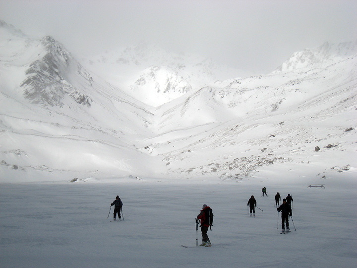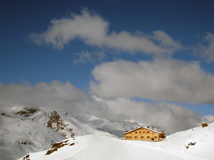 After a night in our hotel, we ride the lift system (one cable car, then followed by 2 chairlifts) to reach the top of the Solda ski complex, 3200 meters. From here, we have a short ski down, then a bit of side stepping to reach the Passo del Madriccio at 3123 meters. We leave the Solda valley and descend into the upper reaches of the Marteller valley down the Valle Madriccio. At about 2200 meters, we leave the axis of the valley and traverse a short way to the Zufallhütte. This is a fine opportunity for a cappucino and apple strudel.
