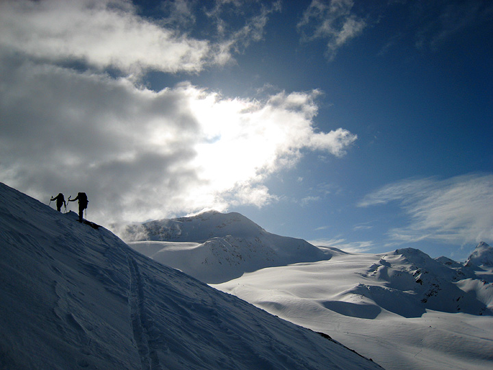At the Zufallhhütte, we put on our climbing skins and head west, up the main Marteller valley, towards Monte Cevedale. Our goal for the day is to reach the Marteller hut, which is located on a bench of rock some 300 meters above the floor of the valley at 2610 meters. As with all the huts in the Ortler area, the Marteller is very comfortable, with amenaties including showers, a heated boot drier, and of course, a full bar. This is a relatively short day, and if we still have energy to burn after arriving at the hut, we can continue touring above the hut up towards the Cima Venezia.