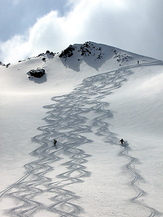 Skiers who regularly enjoy black or double black runs in most western American ski areas should do fine. If you like to get off the piste and into the crud, ski the trees, and in general look for the steeper shots, you'll probably have a great time on this tour. If you tend to stick to the groomed slopes and find the wild untracked a bit intimidating you should think twice about this option. We will likely encounter all different kinds of snow, from the best to the worst, and you need to have sound, energy-efficient strategies to cope with them. A good gauge of your ability can be found in mogul skiing. If you are good in the bumps and seek them out, then you most likely have developed the rhythm and balance needed for steep or difficult snow. You must be able to ski moderate bumps in good conditions, skiing rhythmically and fluidly, following a line near the fall line with good speed control. If you have any doubt about your ability to manage the skiing on this tour, please contact us to see if we can answer your questions. Previous ski touring or mountaineering skills are useful, but not required. If you are a good skier, you will not have difficulty picking up these new skills, as you will already be comfortable on steep slopes. |