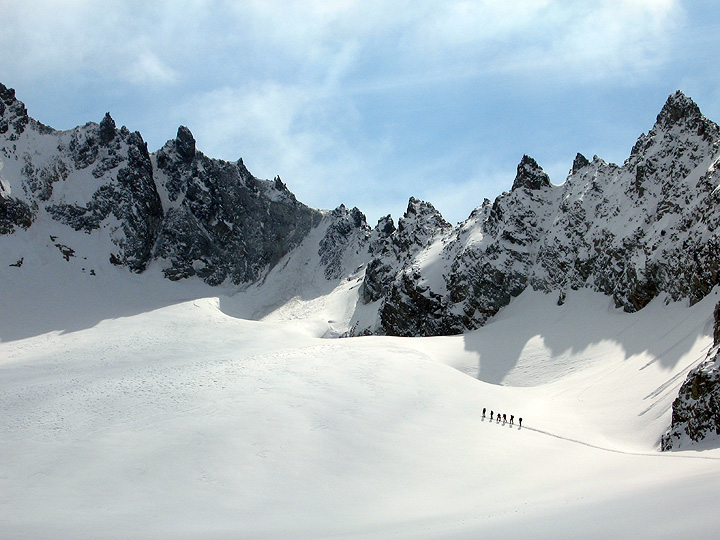 This tour requires a high level of fitness and very good skiing abilities. On a number of days the total elevation gained is over 3000 feet. Being in good shape will ensure you have enough energy to manage (and have great fun as well!) on the long descents which follow. The reason that skiing skills must be at an advanced to expert level has more to do with the conservation and expenditure of energy over a long day than the absolute technical difficulty of the skiing. There are a few steep sections, but for the most part the slopes are not overly steep. The challenge comes in managing poor snow conditions (heavy wet snow, crud or breakable crust) and not losing too much energy or risking injury in the process. Great skiers look like they are hardly working, and this is in fact the case. If your skiing is not up to par you will spend far, far more energy than a better skier. Ski skills required;