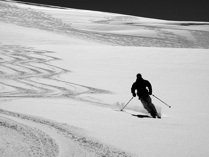 | Skiing down the Findel Glacier from the Cima di Jazzi. Buttery spring corn. | |
