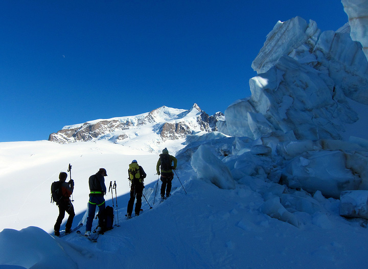 We begin by riding the highest cable car in the Alps, to the summit of the Klein Matterhorn. Arriving at the top station, 3820 meters (12,533 feet), we ski across the Breithorn Plateau and into Italy. Crossing under the south side of the massive Breithorn, we pass though the Schwarztor (the "Black Gate") between the Breithorn's East summit and Pollux. Some 1400 meters (4600 feet) of fun north-facing glacier later, we once again put on our skins and continue up to the ultra-modern Monte Rosa hut.