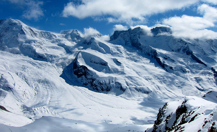 | Looking towards Monte Rosa. The Silbersattel is between the two summits. | |