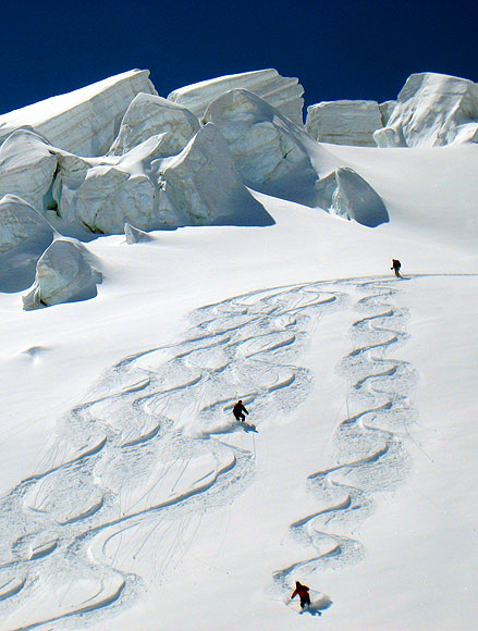 Skiers who regularly enjoy black or double black runs in most western American ski areas should do fine. If you like to get off the piste and into the crud, ski the trees, and in general look for the steeper shots, you'll probably have a great time on this tour. If you tend to stick to the groomed slopes and find the wild untracked a bit intimidating this is probably not a good tour for you. We will likely encounter all different kinds of snow, from the best to the worst, and you need to have sound energy efficient strategies to cope with them. A good gauge of you ability is found in mogul skiing. If you are good in the bumps and seek them out, then you most likely have developed the rhythm and balance needed for steep or difficult snow. You must be able to ski fairly steep bumps in good conditions, skiing rhythmically and fluidly, following a line near the fall line with good speed control. If you have any doubt about your ability to manage the skiing on this route, please join us in the Alps for a shake-down training session. See our page on Chamonix off-piste skiing. You need to be able to do quick and easy kick turns, facing into the mountain. We can review these skills en route. Previous mountaineering skills are useful, but not required. If you are an expert skier, you will not have difficulty picking up these new skills, as you will already be comfortable on very steep slopes. |
