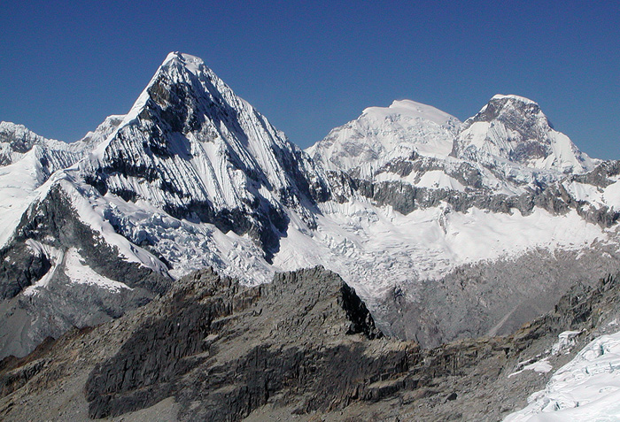 There are no easy routes up this peak. From whichever direction one attempts it, there is unavoidable steep snow and ice. Two "normal" routes exist, The North Ridge and the Southeast Face. Our choice on this expedition is the North Ridge. The route climbs a stepped glacier on the northeast side of the peak, eventually gaining the airy summit ridge, which is followed south to the top. The glacier has several steep steps, alternating with more moderate ground. The climb finishes with about 200 meters of steeper snow and ice before reaching the upper ridge. Descent is by the same route. Because the glacier changes from year to year, the nature and location of the steep steps may also change. Sometimes these steps are not overly difficult, but occasionally, they may present a serious technical ice challenge, with short sections of very steep ice. In addition to Artesonraju, we have also included an acclimatization ascent of Vallunaraju. This is a peak very close to Huaraz, 5686 meters high, and offers a straightforward, but very scenic glacier climb on its southwest side. Trekking option We welcome non-climbing friends and family to join us on this program. While the climbers are busy, struggling away on the peaks, others can adopt a more leisurely set of activities. For example, on Vallunaraju, trekkers can come up to base Camp in the Llaca valley and overnight there with the climbers. The following day, non-climbers can explore the valley below the striking South Face of Ocshapalca, returning to Huaraz for the evening. The climbers come back to town the next day. For the Artesonraju portion of the trip, trekkers can join us to Base Camp, spending a couple nights there. While the climbers move up the mountain the trekkers can continue with the famous Santa Cruz-Llanganuco trek. Trekkers would arrive back in Huaraz perhaps a week before the climbers, and could either return home, relax, or explore more of Peru. Let us know if you might be interested in this option and we can discuss some of the possibilities.