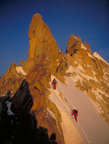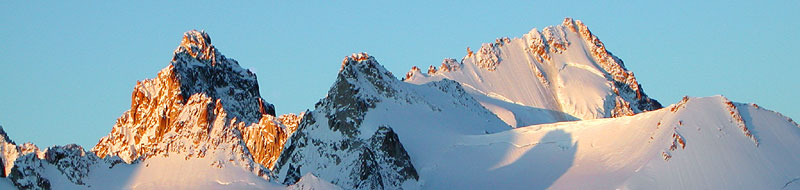 Prerequisites This is a route of skilled and experienced climbers. Climbers need to be able to move quickly on steep and exposed ground, both on rock and ice, and be comfortable climbing 5th class (French 4b) rock in crampons and big boots. Good fitness is key. Combinations There are two other climbs easily accessed from the Albert Premier hut which can combine well with the Chardonnet, the Aiguille du Tour (best climbed by the Arête de la Table, and the Aiguille Purtsheller, who's best routes is the South Arête. The Tour is somewhat easier than the Forbes, and makes a good objective for the preceding day. The South Arête of the Purtscheller is a technically harder rock climb (we use rock shoes here) but is shorter and much less committing. A great four-day trip could include all four summits. |