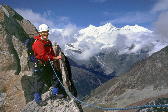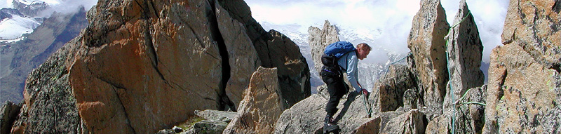 Difficulty While there are many routes on the Horlini, some of them quite difficult, the traverse of the crest is perhaps 5.6 at the hardest, though we normally climb in mountaineering boots, which increases the difficulty somewhat. The route is not overly long and perhaps take 4 hours from hut to hut. Combining the hut approach hike with the Horlini traverse is a moderately big day, and an early start from the valley is advised. Prerequisites Climbers need to be fairly fit, and have experience on 5th class rock climbing. There is considerable exposure on many parts of the route, so a head for heights is necessary. Combinations We almost always combine the Dri Horlini with an ascent of the Portjengrat and/or the Weissmies South Ridge. |