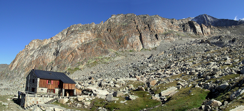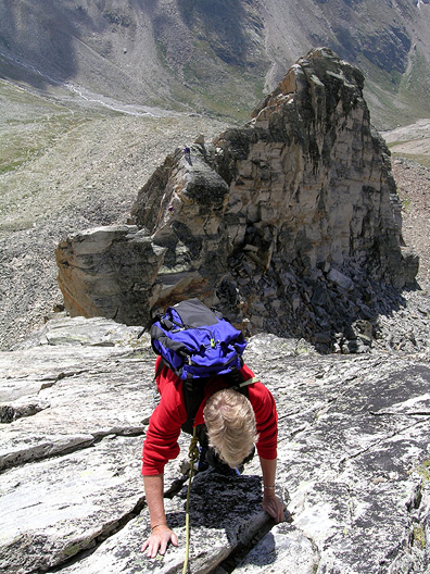 High above Saas Almagell, overlooking the valley is the Almagelleralp, a high alp at the foot of the Weissmies, the Portjengrat and the Dri Horlini. The Horlini are, as the name might suggest, three towers, or horns, set in a row on a rock ridge that seems to have grown out of the alp. The rock is a highly featured, course grained granite, orange, yellow and gray. It is great climbing. And to make it all more fun, the Almageller hut is only minutes from the base of the Horlini. There are many routes on this fin of fine rock. So many, in fact that the hut has published a little topo guide. By far the most popular and longest route is the Traverse, a ridge climb over the summits of the three horns and the other gendarmes of the crest. The climb is not especially difficult, and we often do it in mountaineering boots as training for other, bigger summits. There are a few thin sections, however, also exposed, that require some careful thought and climbing skill. With an early morning start from Saas Almagell in the valley, we can arrive at the hut and still have time to do the Traverse. Or for a more leisurely pace, do the hut approach one day and the traverse the next. The Horlini, the Protungrat and the South Ridge of the Weissmies are what make the Almageller hut a great destination. A very fine three for four day outing is to hike up to the hut, climb the Horlini, either on the first day of the second. Follow this with the Portjengrat, returning to the hut again, then on the last day traverse the Weissmies up the South Ridge and down the Normal Route returning to the valley via the Hohsaas lift. |