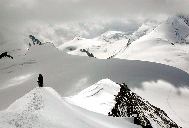 This is a big day, wandering over three very high summits, two of them, the Allalinhorn and Alphubel, over 4000 meters. It is a bit surprising that it can be done in one day from town. But with a starting point of almost 3500 meters at the Mittel Allalin lift station it all becomes feasible. But it is still a considerable outing, up and down, over hill and dale, on both rock, ice and glacier. The Allalinhorn and Alphubel are two of the high peaks on the crest between Zermatt and Saas Fee. Both summits are glacier and snow/ice climbs by their normal routes. The easy access from Saas as well as the fact that they usually present few major technical challenges makes them quite popular. The Feechopf is a smaller summit on the connecting ridge between these peak. The traverse over the Feechopf brings in a bit of variety to the climbing as it includes a fair bit of rock, mostly on an exposed and very fine ridge crest. From Saas we ride the lift system to Mittel Allalin, the highest station in the area. Once on the glacier we climb up among some large crevasses as we gain the Feejoch, the saddle between the Feechopf and the Allalinhorn. Turning left we climb the normal route on the Allalinhorn on steeper but straightforward snow and ice slopes. After returning to the Feejoch, we continue west on the crest, skirting a few towers as necessary to reach the summit of the Feechopf at 3888 meters. From here we descend about 100 meters to the Alphubeljoch at the foot of the South Ridge of the Alphubel. A fine snow arete is followed for quite a way with great views on both sides of the pronounced ridge. The final icy slopes to the broad summit are fairly steep, an good cramponing skills are needed here. For the descent of the Alphubel we have a choice of either retracing our steps to the Alphubeljoch, or we can go down the normal route on the eastern flank of the mountain. Either way we descend the Fee Glacier to the return to the Längflue lift at 2868 meters and continue back to Saas Fee. |