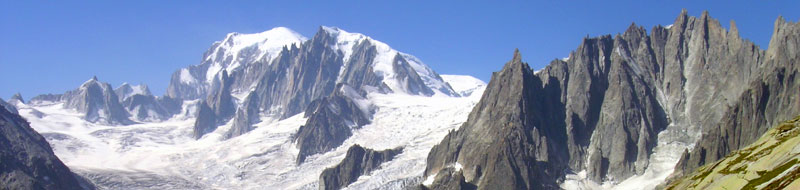 When planning our first European climbing holiday, back in the late 1970s, we naturally thought first and foremost of Chamonix. We had seen a copy of Gaston Rébuffat's 100 Finest Climbs in the Mont Blanc Massif, and the pictures looked just too good to be believed. Now, many years later, we still feel overwhelmed looking up at the Chamonix Aiguilles or across vastness of the Géant Glacier. The wildness of this landscape has never lost its fascination. Although the French Alps contain countless routes worthy of interest, for our descripton of climbs in the area we have chosen several which we feel demonstrate the variety and quality of climbing to be done there, unique in the world. Besides the thousands of quality climbs in the Mont Blanc Massif, it's true that France has much more to offer the climber, being famous as well for its beautiful steep limestone sport climbing. Also, the Vanoise and Écrins massifs to the south provide superb alpine climbing with less company than in the Mont Blanc area. With such an inexhaustible supply of incredible routes, we can only scratch the surface with the suggestions we make here. In the list below we have chosen a few of our favorite routes. It was tough deciding what to include and what to leave out. There are literally thousands of great climbs, and a person could spend a lifetime wandering from valley to valley, picking off the gems. But we had to draw the line somewhere, rather arbitrarily I'm afraid. Chamonix is the logical base for most of the climbs listed here. Easily reached in a little over an hour from the Geneva airport, Chamonix offers convenient access to climbs for every taste and level of ambition. Many of the climbs listed below share a common hut, allowing you to do several day climbs from a common base, enjoying a prolonged stay in the hills. The Cosmiques hut is particularly well suited for this. |