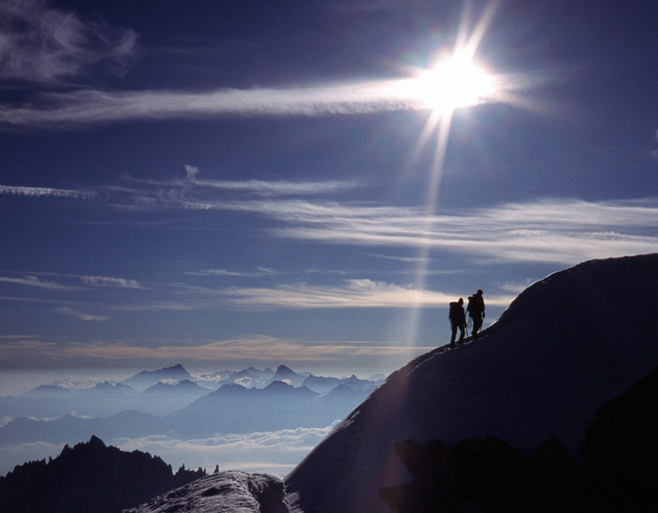 Many of the climbs listed can readily be combined with other nearby routes, stringing together long outings, either hut to hut, or returning to the same hut each night. If you are curious about some of these combinations look at the "Combine With" links on in the gray info box on each climb's page. Or send us a note to discuss particulars. Many climbers come to the valley with the goal of making an ascent of Mont Blanc. A worthy objective, certainly, but one that benefits tremendously from a bit of acclimatization. For any trip that includes Mont Blanc, we recommend at least 3 or 4 additional days of climbing, sleeping in high huts, both for the pleasure of those climbs themselves, and also to allow your body time to adapt to the rarified air you will encounter at almost 16,000 feet on Mont Blanc's summit. See our various Mont Blanc combinations below to give you an idea of what we mean. Also take a look at the pictures on the linked pages below for a "virtual tour" of fine climbing in France. Difficulty Our selection is divided into four different levels of difficulty. We have devised a simple system of symbols to allow you to judge at a glance the difficulty of a given route. Click here to see a table with explanations of symbols. |