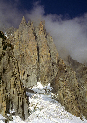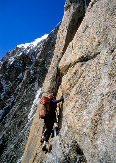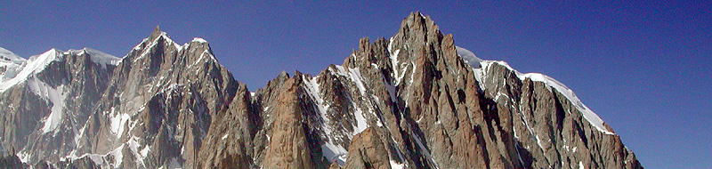 The east face of Mont Blanc du Tacul is a huge wall rising from the upper Géant Glacier. Countless granite pillars and walls are bisected by deep icy couloirs. There are literally hundreds of great climbs on this wall and its satellite summits. The finest of the routes on this face, and arguably the finest on the mountain, is the Gervasutti Pillar. While we have done harder routes in the Alps, both of us would probably agree that this is the finest. This steep and narrow rock buttress drops directly from the summit, and unlike many of the routes on this side of Mont Blanc du Tacul, it rises uninterrupted from glacier to summit, over 3000 feet high. This is a difficult alpine rock climb. Very long, fairly committing and technically demanding. The pillar involves over 25 pitches of rock climbing leading directly to the summit. A pitch or two of 5.10a are only the technical crux of this long, sustained and committing route. For extremely fit and acclimatized, very experienced rock climbers comfortable following 5.10 with a day pack. It is possible to climb most of the route and then rappel allowing us to leave boots, crampons and ice ax at the base. However the best way to do the climb is in its entirety, from the base to the summit, which requires that our snow and approach gear be carried up the route. The approach and descent are via easy glacier and snow slopes, and the climb is done from the Cosmiques hut. The total time for this climb usually involves parts of 3 days. The first day is the approach to the Cosmiques Hut, the climb is completed on the second day, and a third day is normally required to get back to town , as it is unlikely that we will descend from this long route in time to catch the last telepherique into Chamonix, necessitating another night in the Cosmiques Hut. |