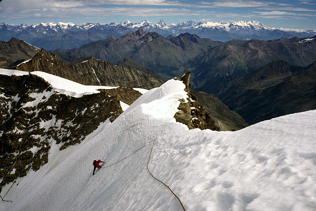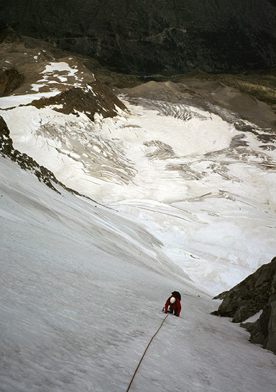 Years ago a friend and colleague, Alain Comeau encouraged me to go and climb the Gran Paradiso. And, "if you go" he said, "do the Northwest Face". This was great advice. The Northwest Face of the Gran Paradiso is a large sweep of ice, about 1200 feet of steepness the blankets the northwest side of the peak. The angle is fairly constant at about 50 degrees, with perhaps a few degrees steeping in the lower part. There are three aspects to this climb that make it so special, and in many ways unique for big ice faces. First, it is generally uncrowded. Even though it gets many ascents, there seem to be far fewer climbers on it than one would find on comparable faces in the more busy part of the Alps. Second, the route is very clean, there is little rock fall or other objective hazard nastiness. And third the face is wide and open. this gives it a sense of exposure unlike routes that follow gully systems or other confined features. The Northwest Face is climbed from the Chabod hut, a fine and newly built hut on the northwest side of the Gran Paradiso. Day one of the trip is a pleasant hike up to the hut. On our second day we walk up to the glacier, climb its lower slopes to the base of the face to begin the pitched climbing. After crossing the bergschrund, we climb about 10 or 11 pitches of ice to the ridge crest. The last section of the climb follows the ridge to the summit of the Gran Paradiso, first on snow and then on a fun rock crest. Descent is by the normal route back to the Chabod hut and the car in the valley. |
