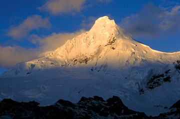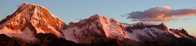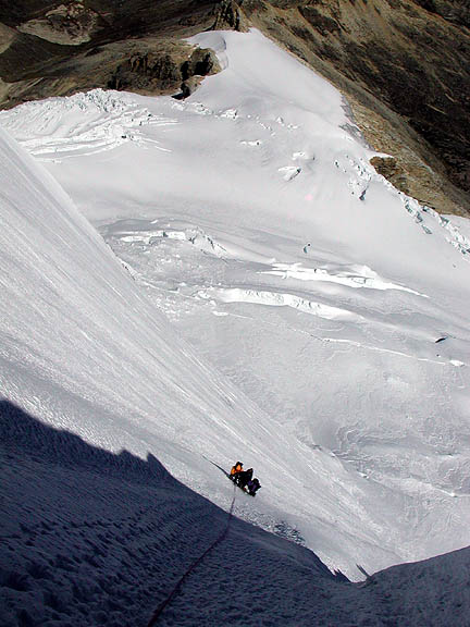 You may have noticed that our maximum ratio of climber to guide is only 2:1. We feel this better allows us to address you personal needs and also to make ascents of the most challenging climbs of which you are comfortable capable. We wan to maximize your potential, both for learning as well as for enjoying great climbs. The lower ratio is significantly different from many other guide services who offer similar trips, whether they be in Peru, Bolivia or Ecuador. In choosing a trip you should give careful consideration to the maximum climber to guide ratio as this, more than any other single factor determines what you will be able to accomplish. Difficulty There is a great deal of latitude in how difficult this trip might be. With such a low ratio we can do a good job of tailoring the the trip to an individual's ambitions and energy levels. It remains, however, a trip at high altitude and because of this a high level of fitness is required. All of the summits in the area require cramponing and considerable rock scrambling, most of it easy, but on rough ground. The approach trails to both Urus and Tocllaraju are very rough and steep. The altitude gain from base camp to even the lowest summits is at least 3000 feet, again emphasizing the need for good fitness. Program Prerequisites Climbers need to be in excellent physical condition, and tough! Previous off-trail scrambling experience is required. Technical climbing experience is helpful, but not required, so long as you are quite strong. Previous high altitude experience is recommended, but not required. If you hope to do the harder climbs, such as the West Face of Tocllaraju, then you'll need considerable previous experience in technical ice. |