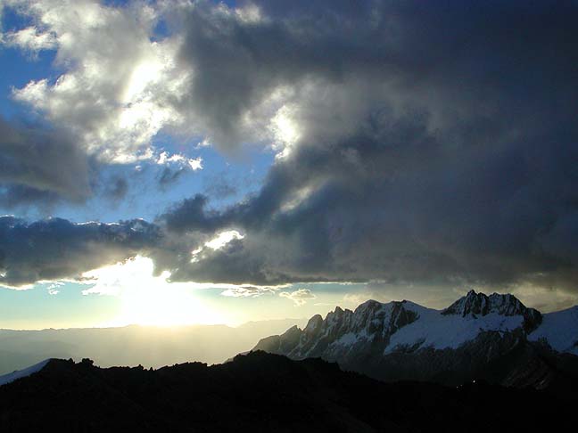 Leaving Huaraz early we drive a short way north, downstream in the Callejon de Huaylas, the large valley that borders the Cordillera Blanca on its west side. Soon we turn east and climb up to the town of Collón. From here, we load our equipment on burros and begin the easy trek into Base Camp. The trek normally takes only about 4 hours. This is a lovely walk, passing through dense forests of Quenual trees before emerging into the upper broad valley where we will establish our base camp at about 14,000 feet. This will be our home for the next 2 weeks, and other than the high camps we may elect to place during our ascents around the valley we will get to enjoy the relative comfort of of a well equipped cooking tent and Emilio's superb cooking talents. |