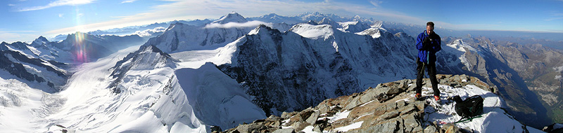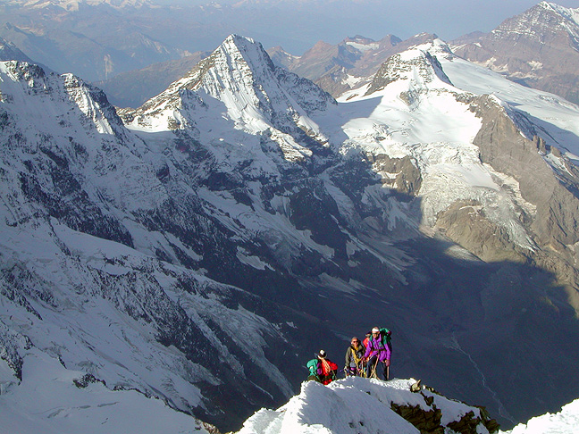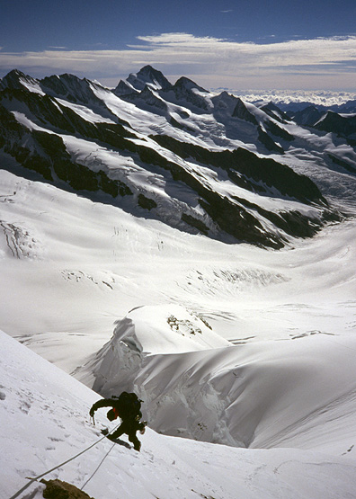 The Jungfrau (4158 meters, 13,638 feet) is the westernmost and highest of the famous Eiger, Mönch, Jungfrau trilogy. It is a truly high altitude alpine route with an easy approach by train from town! The Jungfraujoch railway is a wonder of 20th century technology and ambition, drilled through the solid rock of the Eiger. It spirals its way through the mountain, emerging only for terrifying glimpses over the Nordwand and the Eismeer Glacier, and finally ends at the Jungfraujoch, the 12,000+ foot high pass between the Mönch and the Jungfrau. The original plan was to continue burrowing to the summit of the Jungfrau itself, but wartime and lack of finances intervened, and thankfully the idea was abandoned. Most climbers spend a night in the cozy and comfortable Mönchsjochhütte (try saying that ten times fast) at 12,000 feet, before the climb. Starting out before daylight, the route crosses the Jungfraufirn, and climbs steep mixed snow and rock to the Rottalsattel, at the base of the summit tower. From here, we traverse a steep snow and ice slope which leads to the easy but somewhat airy rock of the summit ridge. This climb has a bit of everything, a glacier approach, followed by rock climbing, then a snow ridge to a pass, and more and steeper snow, ice and rock to the airy summit. |