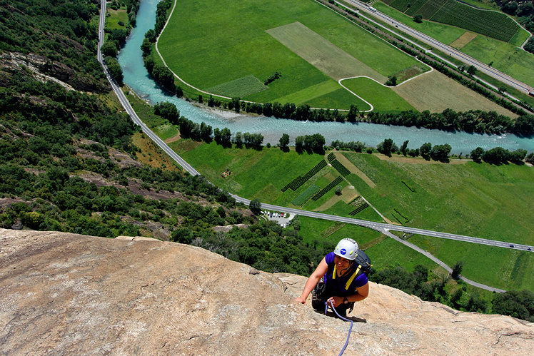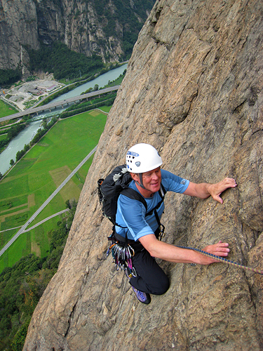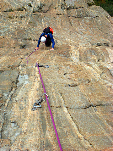 The Aosta Valley in norther Italy is full of rock. The local guidebook, Mani Nude, includes many hundreds of pitches of great, usually well-bolted climbing. The Corma di Machaby is only one of the many cliffs available here, but without a doubt the most impressive. This is an immense slab of clean gneiss, glowing yellow and orange in the afternoon sun. The general angle is fairly moderate, but consistent, yielding pitch after pitch of superb face climbing. The best season for Aosta rock is on either side of summer. Usually, in mid-summer the rock is too hot. But often when stormy weather blows in from the west or northwest, the rain shadow effect of the Alps can bring comfortable and dry climbing weather here, when the Chamonix valley is rainy and cold. It is at times like this that we often find ourselves dashing from a wet Chamonix, though the Mont Blanc tunnel, finding sunshine and warm rock in Machaby. This is not a great beginners area. Most of the good climbing starts at about 5b or 5c (5.8 or 5.9 USA). But the gear is generally very good and the generally low angle rock means that you'll have plenty of time to work out the moves without becoming too pumped. There are several different sections to the cliffs here. The Gruviera offers shorter routes, from 1 to 4 or 5 pitches. The main wall, the Corma di Machaby has fantastic routes, some over a dozen pitches. Mont Coudrey to the south has a very large selection, from short routes to very fun long climbs, include the 9 pitch Dr Jimmy 5b (5.8 USA). The Pilier Lomasti is a very clean buttress found high above the valley, well above the Corma di Machaby. |
