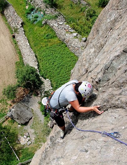Difficulty There are literally hundreds of climbs in this area, from moderate to extremely difficult. The easiest routes start at about 5.6 (French 4c) For the longer climbs, the difficulty begins at about 5.8 (French 5b). The climbing is not, in general, overly strenuous. Footwork is key, with the most challenging sections including thin face climbing. Prerequisites Since there is something for everyone here, we can match the route with your previous experience. However, there is not a great deal of very easy climbing here, so we recommend "learning the ropes" in a less demanding environment, such as Les Gaillands in Chamonix. |