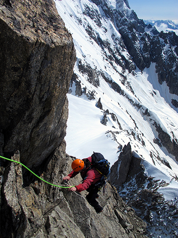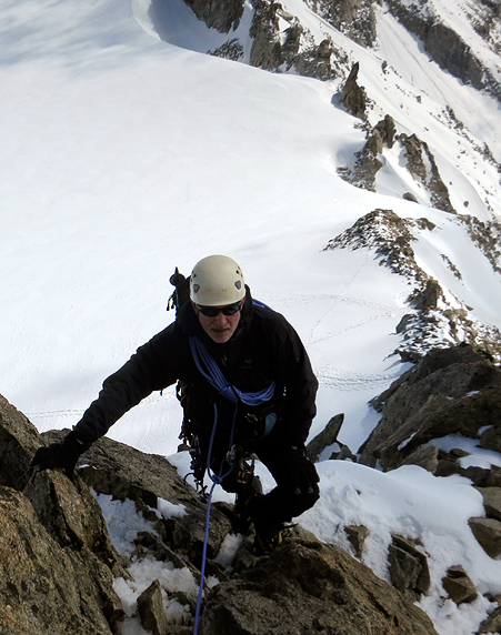 The Aiguilles Marbrées is a tight group of rocky spires that form the border between France and Italy, not far from the upper station of the Point Helbronner cable car. Easy access, spectacular surroundings and enjoyable climbing have made these summits deservedly popular. There are two main ridges on the peak, the longer South Ridge and the shorter, but overall a bit steeper East Ridge. While climbers often ascend and descend by the same route, the most interesting and enjoyable outing includes a traverse of the peak. If conditions allow, we usually prefer to climb up the East Ridge and Descend by the South. Occasionally, the bergschrund on the South Ridge can be open and difficult. A traverse that includes a descent by this route, allows for the option of an easy rappel over this obstacle. This is a rocky summit, and the main difficulties are on the sharp granite crest. But the hard bits are short and with the numerous rock horns, we have the ability to belay all the tricky bits. The Traverse of the Aiguilles Marbrées is also quite fun in snowed up, winter conditions, and makes a great training climb when crampons must be worn for some or all of the rock sections. Difficulty This is a short route, by Alpine standards. But it does involve some real climbing. There are a number of short rock pitches we will need to belay, both on the ascent as well as the descent. This route is a good choice if you are looking for a shorter climb, or if the bigger routes are out of condition because of new snow. And it is a great introduction to Alpine rock ridges. |