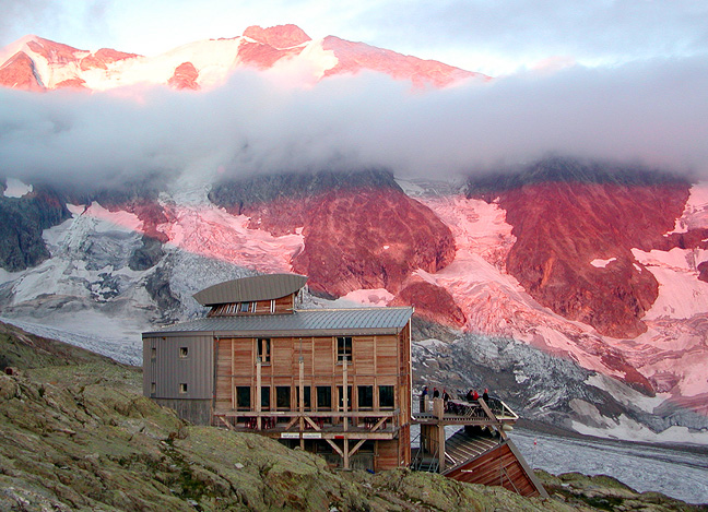 Difficulty The difficulty of this climb varies a bit with conditions. Earlier in the season, when there is more snow, the track is usually better, and there is less ice on the route. But even later in the year, conditions are usually quite good, and the climb can be done most any time from June through September. Though the technical difficulties are not great, this is a long route, both in the approach to the hut, as well as in the climb itself. Good fitness is key, as well as a certain degree of comfort in crampons on steep slopes. There are only a few belayed sections, usually on ice, once the snow has melted off. Prerequisites Climbers need to know how to flat-foot up moderately steep frozen snow, as well as front point on harder ice. Fitness is important, as the days are long on this route. Combinations From the Conscrits hut, you can traverse the Dômes de Miage, and continue to the Refuge Durier at the foot the Aiguille de Bionnassay. This, in turn can be traversed the following day to the Dome du Goûter. From here, you can either descend the normal route on Mont Blanc, go down to the Goûter hut and climb Mont Blanc the following day, or, if you are super fit and very ambitious, continue over Mont Blanc and reverse the Traverse from the Aiguille du Midi for a grand traverse of the massif. The most sensible way to do this major traverse is to plan on nights at the Conscrits, Durier and Goûter huts, then finish via the Aiguille du Midi. All ascents of the Aiguille de Bionnassay are difficult, considerably harder than the Miage and suitable only for highly experienced climbers. |