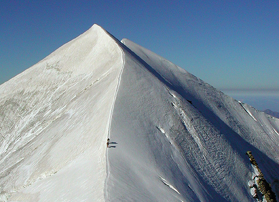 To the northwest of Mont Blanc there are a number of fine summits that visitors to Chamonix often overlook. Two of the most impressive and are the Aiguille de Bionnassay and the Dômes de Miage. While the Bionnassay is a difficult climb, the Traverse of the of the Dômes de Miage offers a very fine two or three day outing of more moderate climbing. The climb itself traverses the three summits of the peak and includes both rock and ice. In the photos on this page you can see that the route is often right on the crest of the the snow arête, exposed and airy. But usually there is a good track and the climbing is not overly technical. This route is very scenic, and the views of nearby Mont Blanc and the Bionnassay are hard to beat. As a final bonus, we stay at the Conscrits hut, a very new, thoroughly modern and comfortable hut, one of the best in the massif. To reach the hut wee must hike from near the town of Contamines, to the west of Mont Blanc. We start by following for a short way the Tour du Mont Blanc, the famous trail that circumnavigates the entire range. But soon we leave this route and climb up towards the Conscrits hut on the edge of the glacier. Part of our approach to the hut involves getting on the glacier itself, which is usually bare ice and covered with rubble. Normally crampons are not necessary for this section. Higher we leave the glacier and climb through beautiful alpine meadows to finally reach the hut. The Dômes can be traversed in either direction, though the east to west sense is more common. We start gradually, first on trail, then on glacier, finally reaching the col, just east of the east summit. We follow the ridge back left over all the summits, before descending back to the hut on easy terrain. |