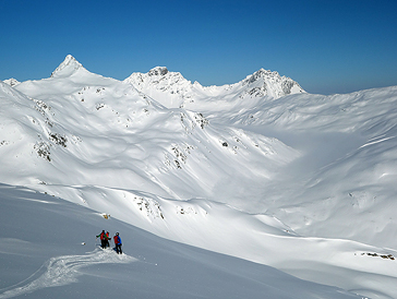 Later in the season we plan to return to the Silvretta (February 23–28, 7 spaces available); the Ortler (trip full, sorry!); the Haute Route de la Vanoise (also full, yikes!); the Albula tour from St. Moritz to Davos March 21-27 (two spaces still available); the Chamonix to Zermatt Haute Route via Verbier, April 1-8 (four spaces still available); and finally back to the Berner Oberland, April 27 – May 2 (seven spaces still available).