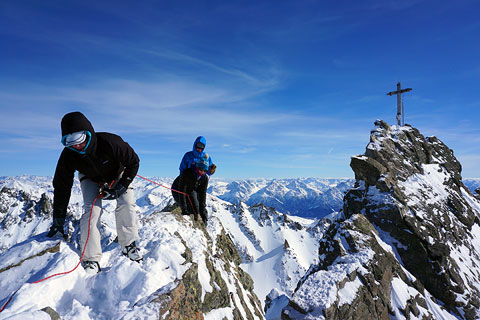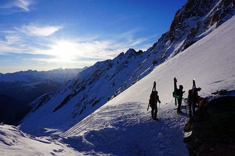Next up is a return to the Silvretta region straddling the Austrian/Swiss border. One of our favorite tours, this area combines reasonable length days, comfortable huts with amenities such as hot showers, and a variety of ski terrain from easy to challenging, making it a great choice for those new to the "hut to hut" lifestyle of the European Alps. There is also the possibility for the more intrepid, of some truly "alpine" climbing above the ski cache, roped up on the airy rock ridges of the Dreiländerspitze and the Piz Buin. This tour is also wide open at the moment, running March 7-12.