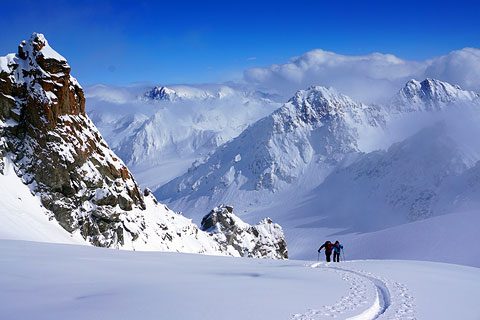 We will return this year to friendly, sunny (usually!) Italy for a Gran Paradiso Haute Route, from April 19 to 24. Crossing high rugged ridges between the headwaters of the Rhemes, Valgrisenche and Valsavarenche valleys, we make our way to the Gran Paradiso, whose ascent finishes the week. We have room for 6 more skiers on this trip.