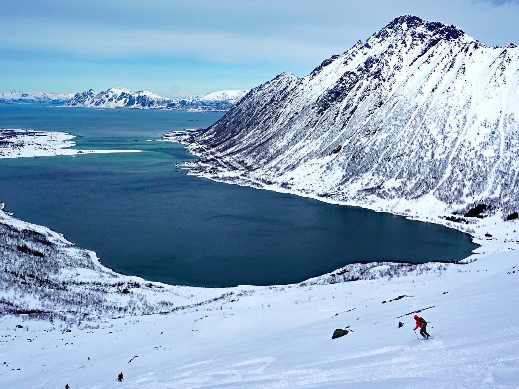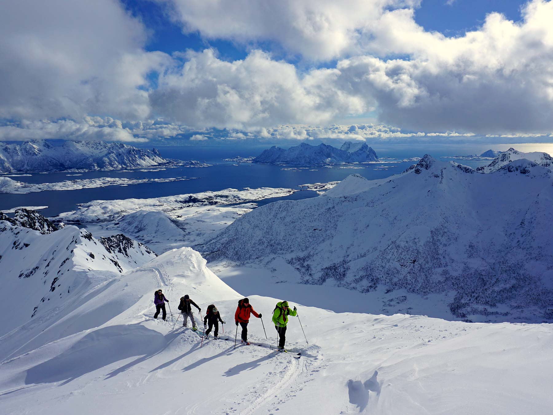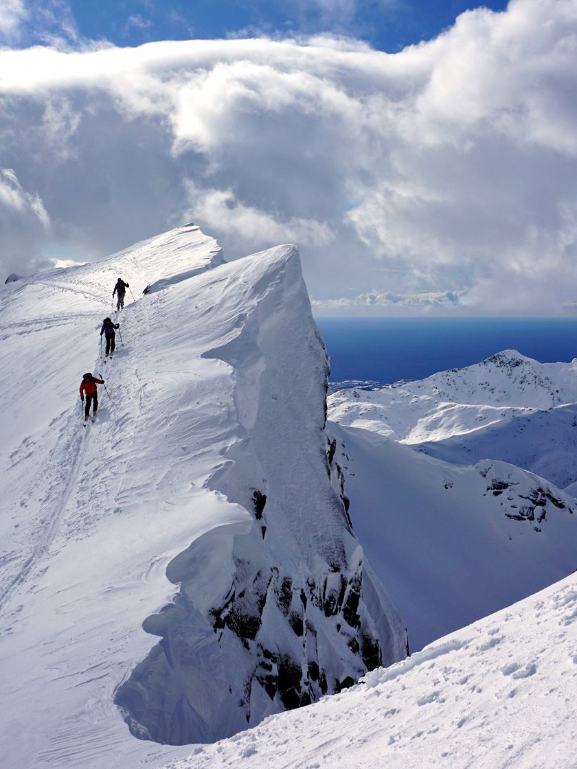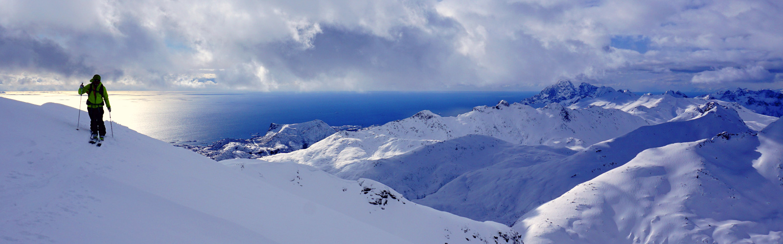 Lofoten has become a popular ski touring destination, with good reason! Otherworldly beauty rewards the effort of every climb. The vast and complex terrain offers a wide choice of aspects, steepness, and length and difficulty of each day's tour. The comfort and support of our "base camp" at the Lofoten Ski Lodge, makes every day a true vacation from start to finish. We offer this trip as visiting guides, at the kind invitation of Seth Hobby, owner and operator of Northern Alpine Guides. His support and hospitality at the Ski Lodge make this opportunity possible for us and our guests. We propose 6 days of skiing in our standard itinerary, but as it is also available as a private trip, it can be be shortened or extended as desired. That said, 6 days is probably the minimum one would want, to explore and enjoy what this area has to offer, and to compensate for the long trip (for most North Americans at any rate) required to get there! We target late March or very early April for this tour. Days are getting longer and warmer by then, yet typically still cold enough that good, wintry snow conditions remain likely. For more detail and to get a feel for the character of this place and this trip, scroll down to view the "Lofoten Logistics" information, and/or click on the link below to see pictures from our previous trip. Also, please don't hesitate to contact us for more information, we would love to hear from you. We hope you'll consider joining us in Norway next season!