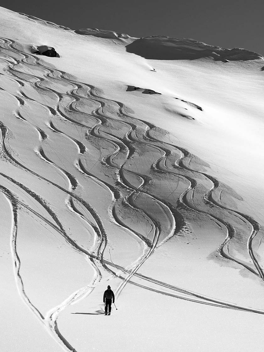 Skiers who regularly enjoy black or double black runs in most western American ski areas should do fine. If you like to get off the piste and into the crud, ski the trees, and in general look for the steeper shots, you'll probably have a great time on this tour. If you tend to stick to the groomed slopes and find the wild untracked a bit intimidating you should think twice about this option. We will likely encounter all different kinds of snow, from the best to the worst, and you need to have sound, energy-efficient strategies to cope with them. A good gauge of your ability can be found in mogul skiing. If you are good in the bumps and seek them out, then you most likely have developed the rhythm and balance needed for steep or difficult snow. You must be able to ski moderate bumps in good conditions, skiing rhythmically and fluidly, following a line near the fall line with good speed control. If you have any doubt about your ability to manage the skiing on this tour, please contact us to see if we can answer your questions. Previous ski touring or mountaineering skills are useful, but not required. If you are a good skier, you will not have difficulty picking up these new skills, as you will already be comfortable on steep slopes. |