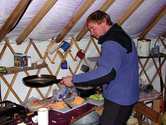 Keith Garvey does Mexican in the Plummer yurt. These yurts are owned and operated by Rendezvous Ski Tours, out of Driggs, Idaho.