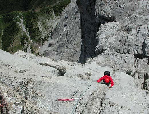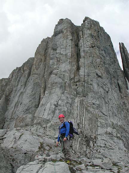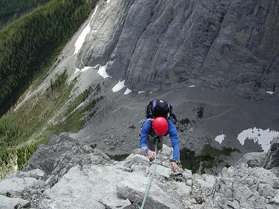 Rockies with Chris Kulp In late June of 2001, Chris Kulp and I spent 10 days climbing in the Canadian Rockies. As is not so uncommon in the Rockies we were chased around by the weather, trying to make the best of the ever changing mix of sun, cloud rain and snow. Here are is one of the climbs we enjoyed. Mount Louis is one of Conrad Kain's great routes. In 1916 he climbed this outrageous looking peak with A.H. MacCarthy in a time that is still fast for today's high-tech climbers. |