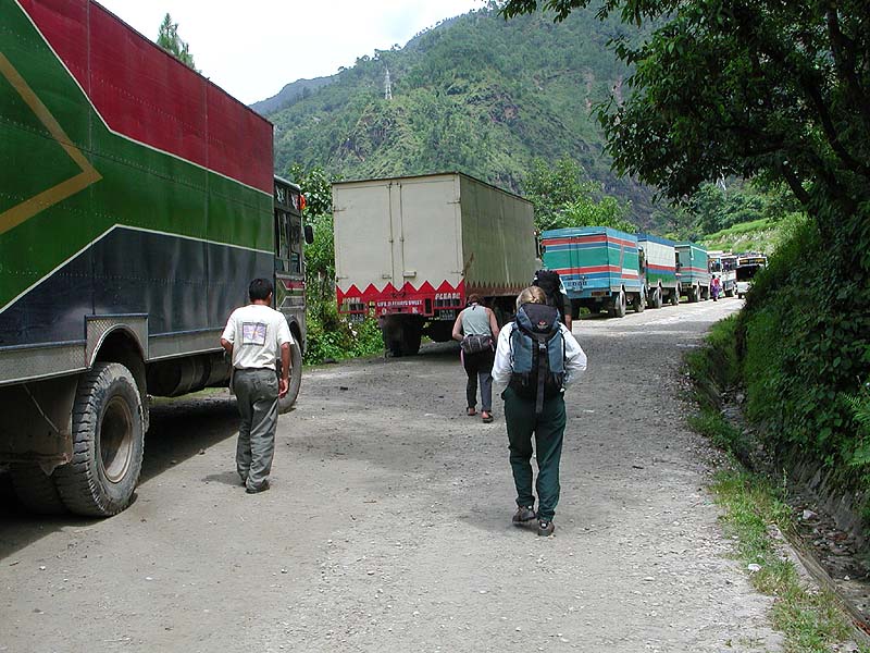 Trucks lined up at the first road washout
