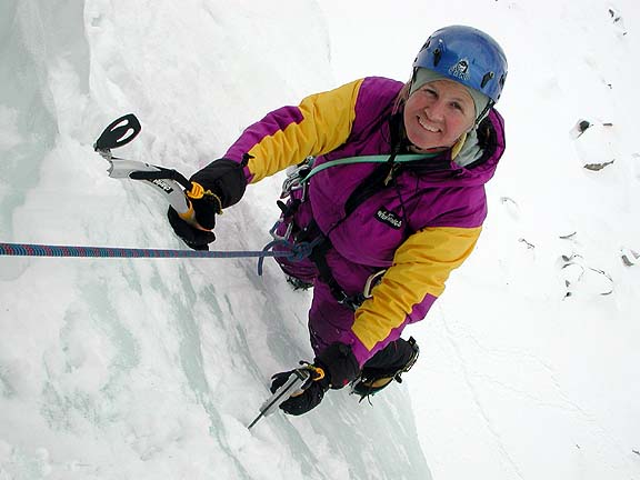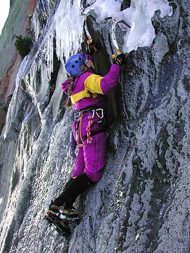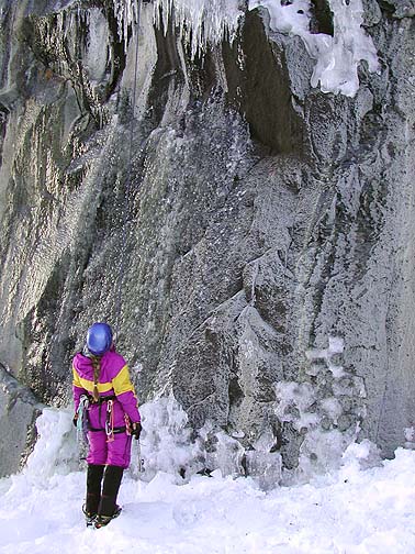 Kathy contemplates the cruxy start to the left side of the Narrows climb. |
