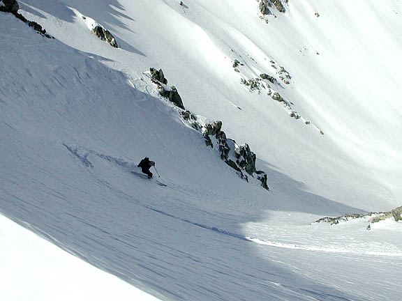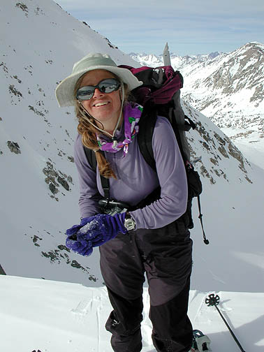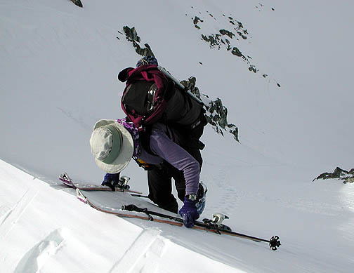 Kathy cranks the first turn in funky snow. The couloir is 42 degrees, according to our inclinometer. It felt it. |