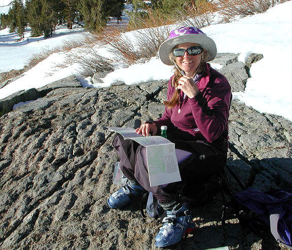Kathy walking up the road at the start of the ski to Kearsarge Pass. |