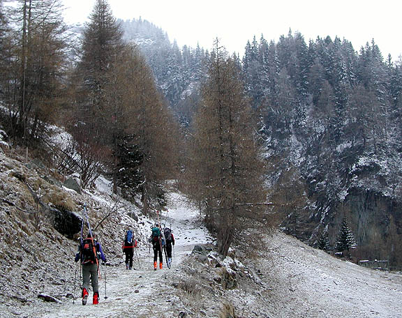 Just outside of Bourg-St-Pierre. We carry our skis until we reach snowline. |