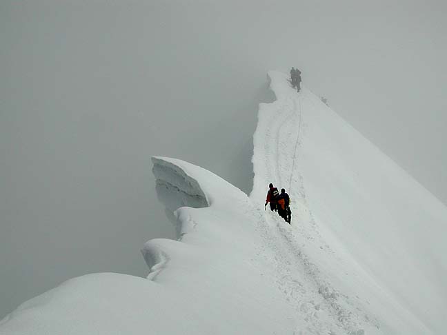Our first day of climbing, the Mönch's SE Ridge. Though we didn't see much, the climbing itself is good, with the route in fine condition. |