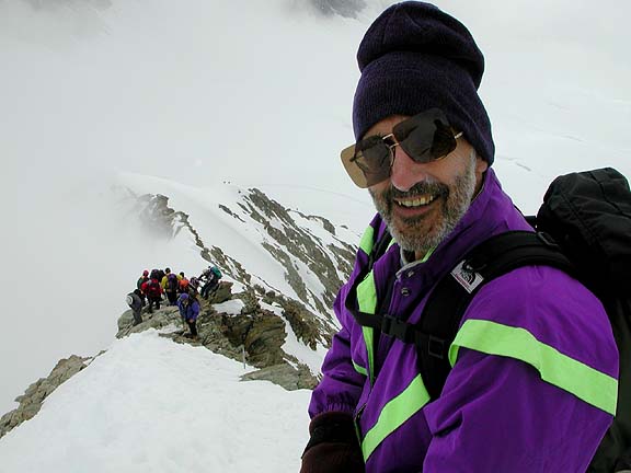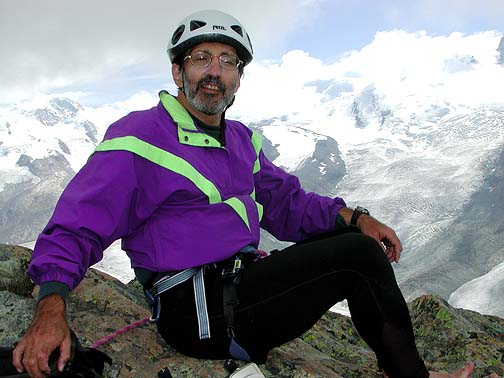 On the summit of the Riffelhorn. The impressive north faces of the Breithorn and Liskamm give the climb a distinctly alpine flavor.. |