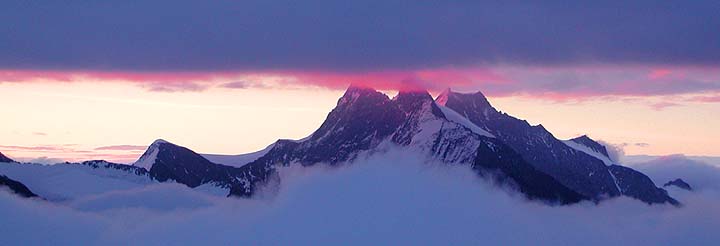 Almost at the last minute, Chris Sicaras from New York, flew east to join Mark for a week of climbing in the Berner and Zermatt areas. Typically, for this summer at least, the weather was problematic. We started in the Berner, climbing the Mönch and Jungfrau, both in near whiteout conditions, then, finally as the weather cleared, we traveled to Saas Fee for a good climb of the Nadelhorn, finally in good weather. With one more day left, we climbed the "Egg" route on the Riffelhorn, a fun rock climb overlooking the Gornergletscher. |