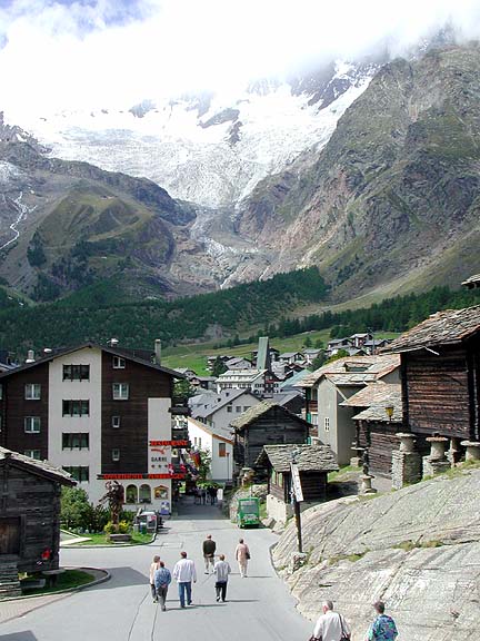 We traveled to Saas Fee to climb the Nadelhorn. Saas Fee is like a sleepy Zermatt, but the mountains seem closer and the valley deeper. |
