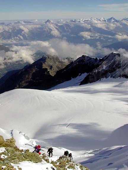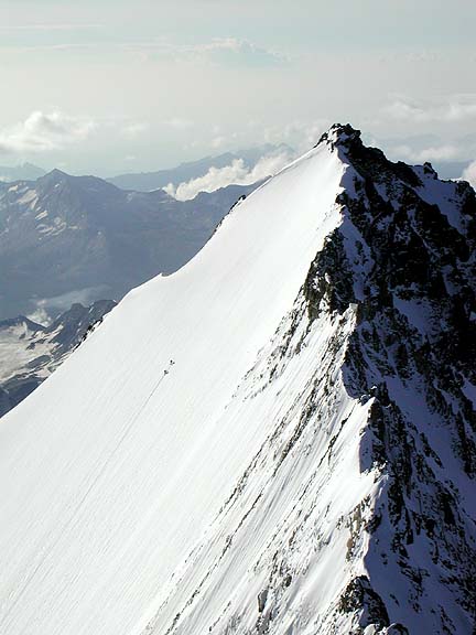 Climbers coming up the final rocks of the Nadelhorn. The peaks of the Berner Oberland, far to the north are seen behind. |