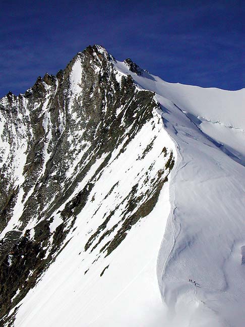 The Nadelhorn, as seen from just above the Windjoch. Climbers can be seen in the lower-right corner. |