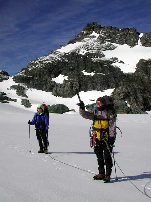 Our first day, about half and hour after the helicopter dropped us off at Bevan Col. Susan and Kathy check out the route on Aspiring. Bevan Col can be seen behind on the left. |