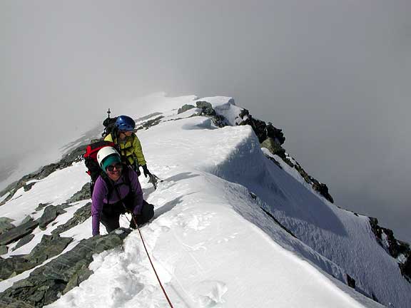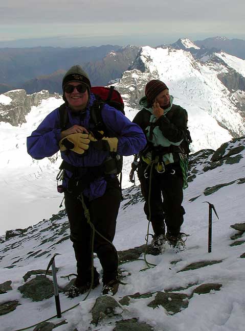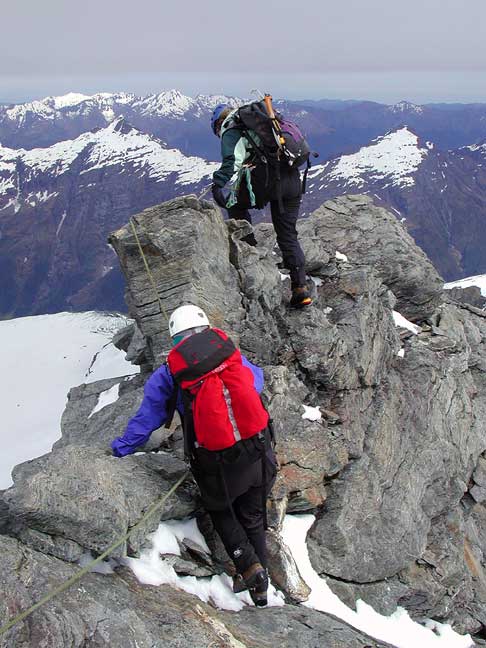 The following day, climbing in and out of cloud, we climbed Earnslaw. Here Susan and Kathy enjoy the sun on the final summit ridge. |